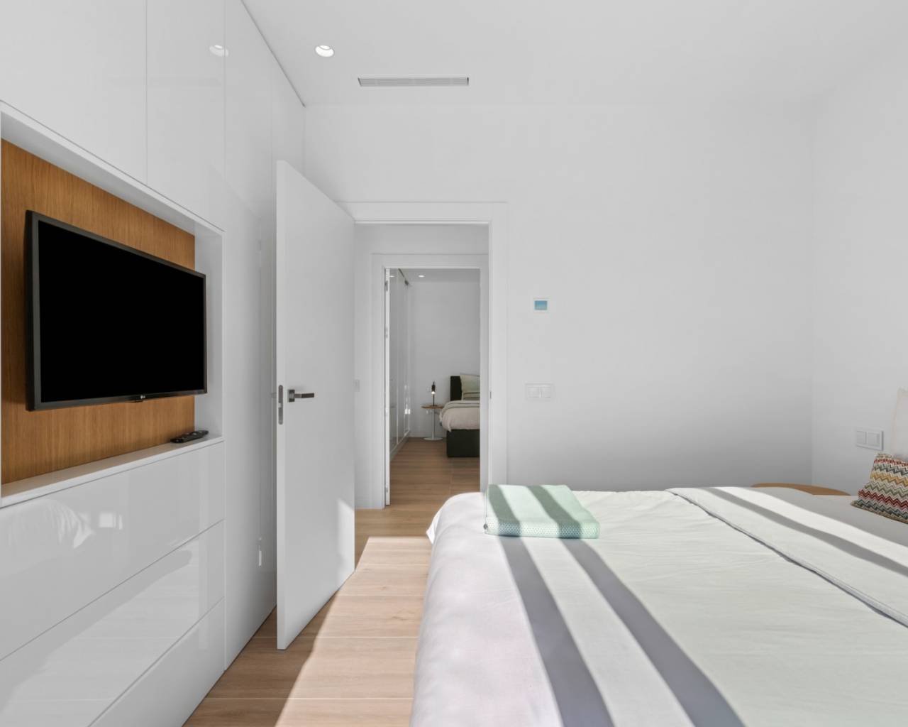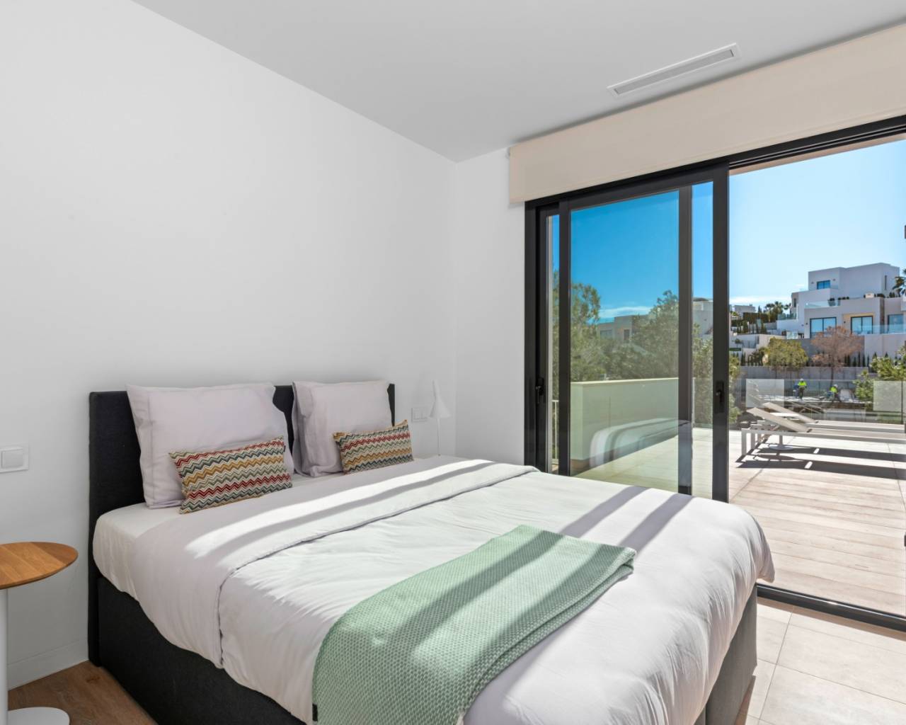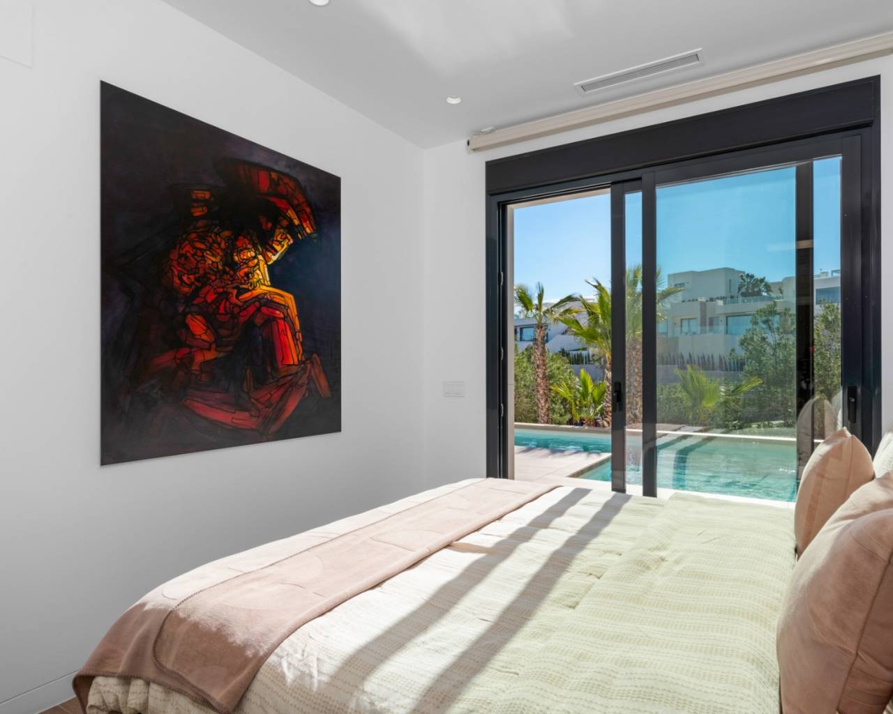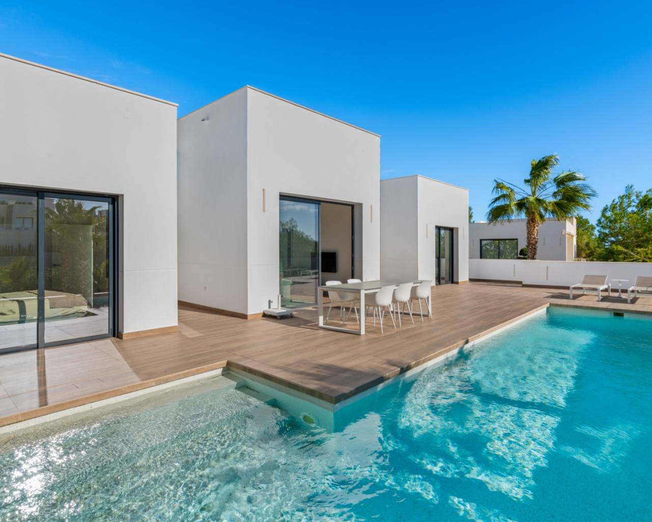 The main floor features three spacious bedrooms and two bathrooms, alongside a bright open-plan kitchen and lounge area. From here, sliding doors lead directly to the spectacular pool terrace, complete with several seating areas and a large heated swimming pool—ideal for entertaining or relaxing under the Spanish sun.